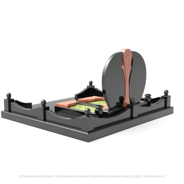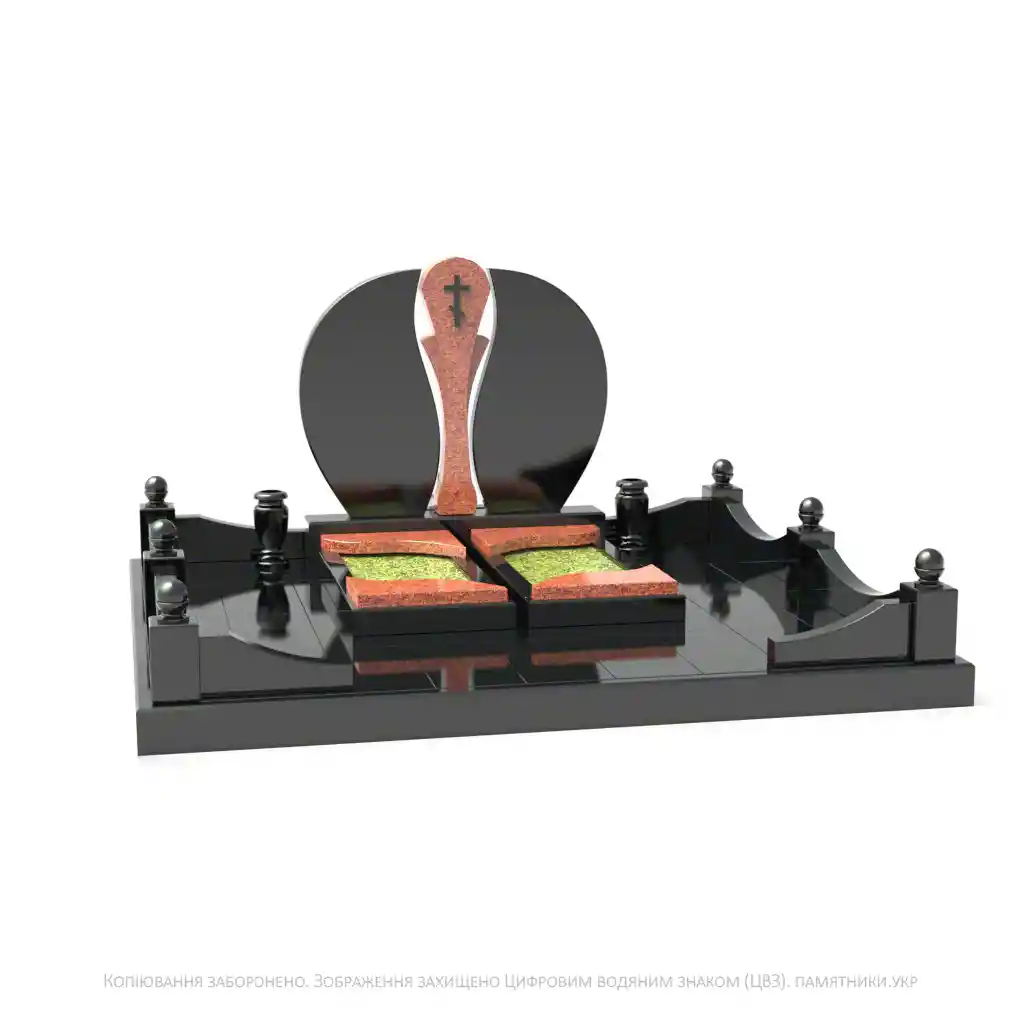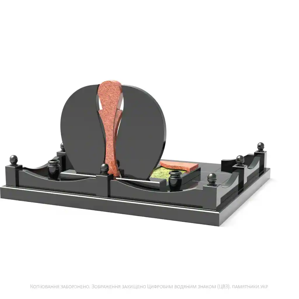 Каплевидні елементи надгробка мають достатньо місця для нанесення портретів, інформації чи малюнків. Лаконічна гранітна огорожа з декоративними стовпчиками завершує композицію.