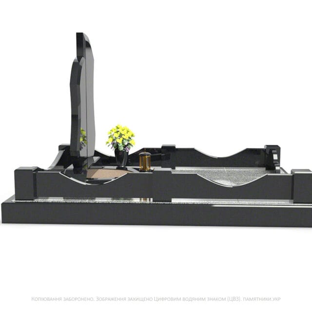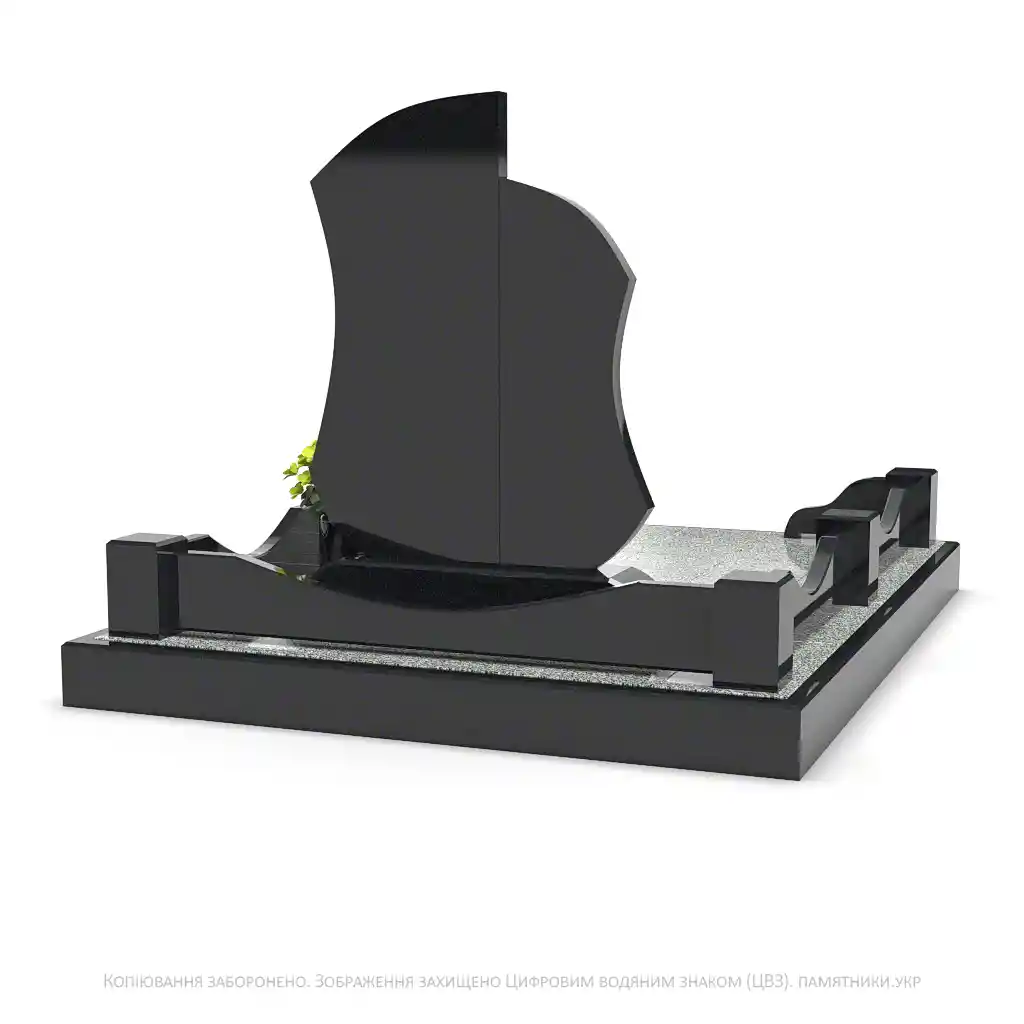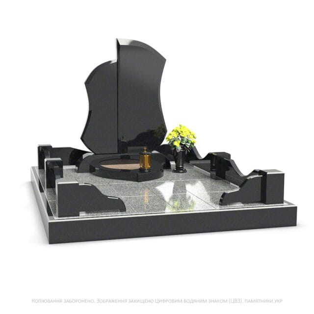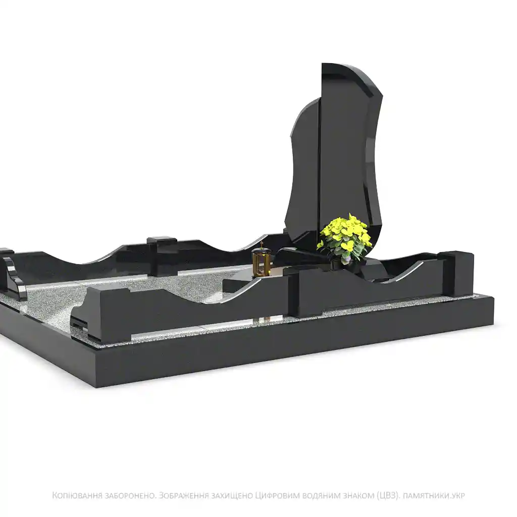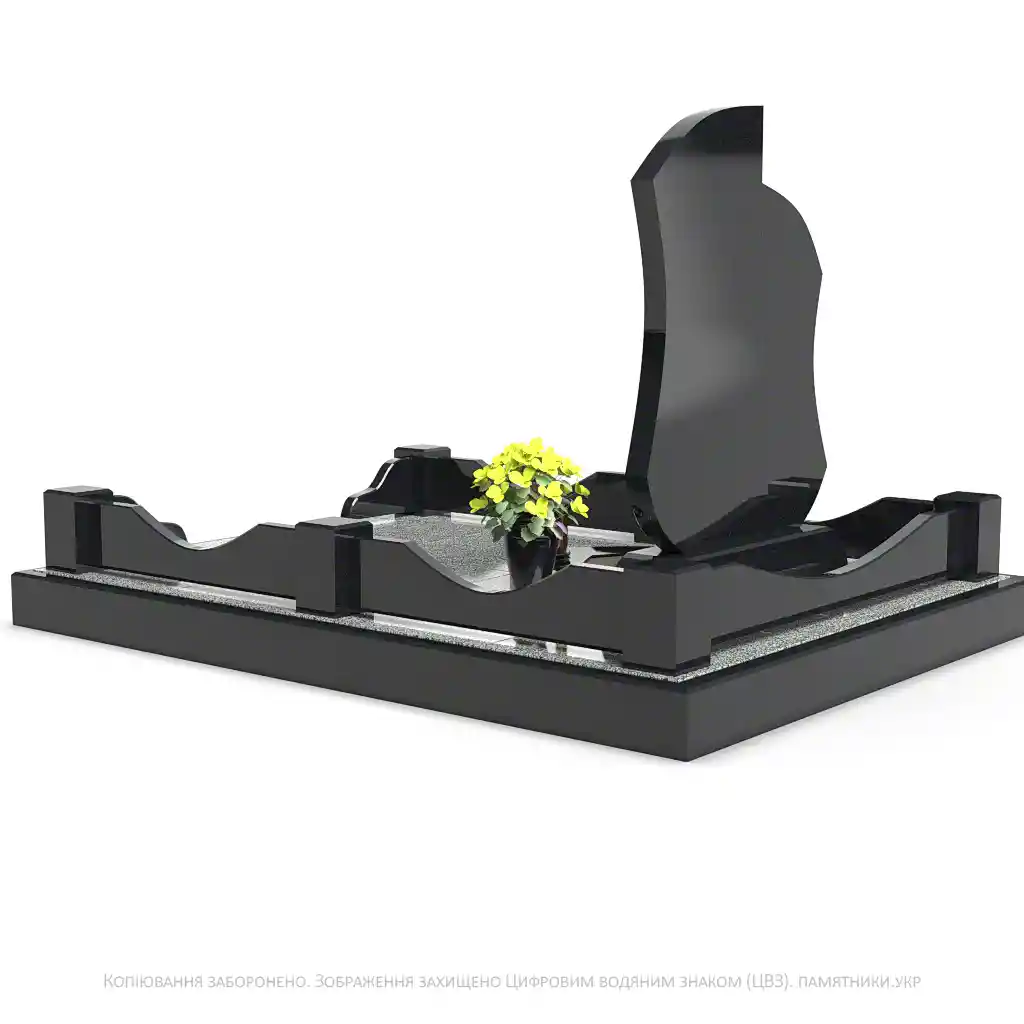 Каплевидні елементи надгробка мають достатньо місця для нанесення портретів, інформації чи малюнків. Лаконічна гранітна огорожа з декоративними стовпчиками завершує композицію.