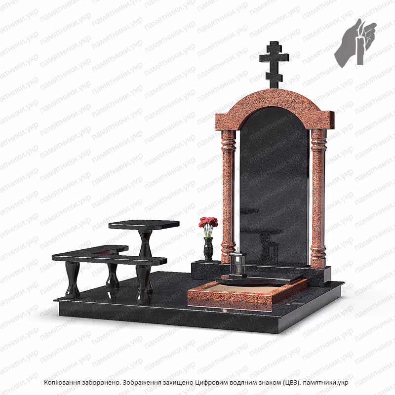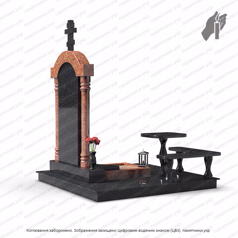 This model is not just a monument, but a complete architectural solution for the improvement of a family burial site. The central part is occupied by a majestic composition: a black stele, crowned with a massive arch of red granite on refined columns. The structure is crowned with a strict Orthodox cross made of black gabbro, symbolizing faith and humility.