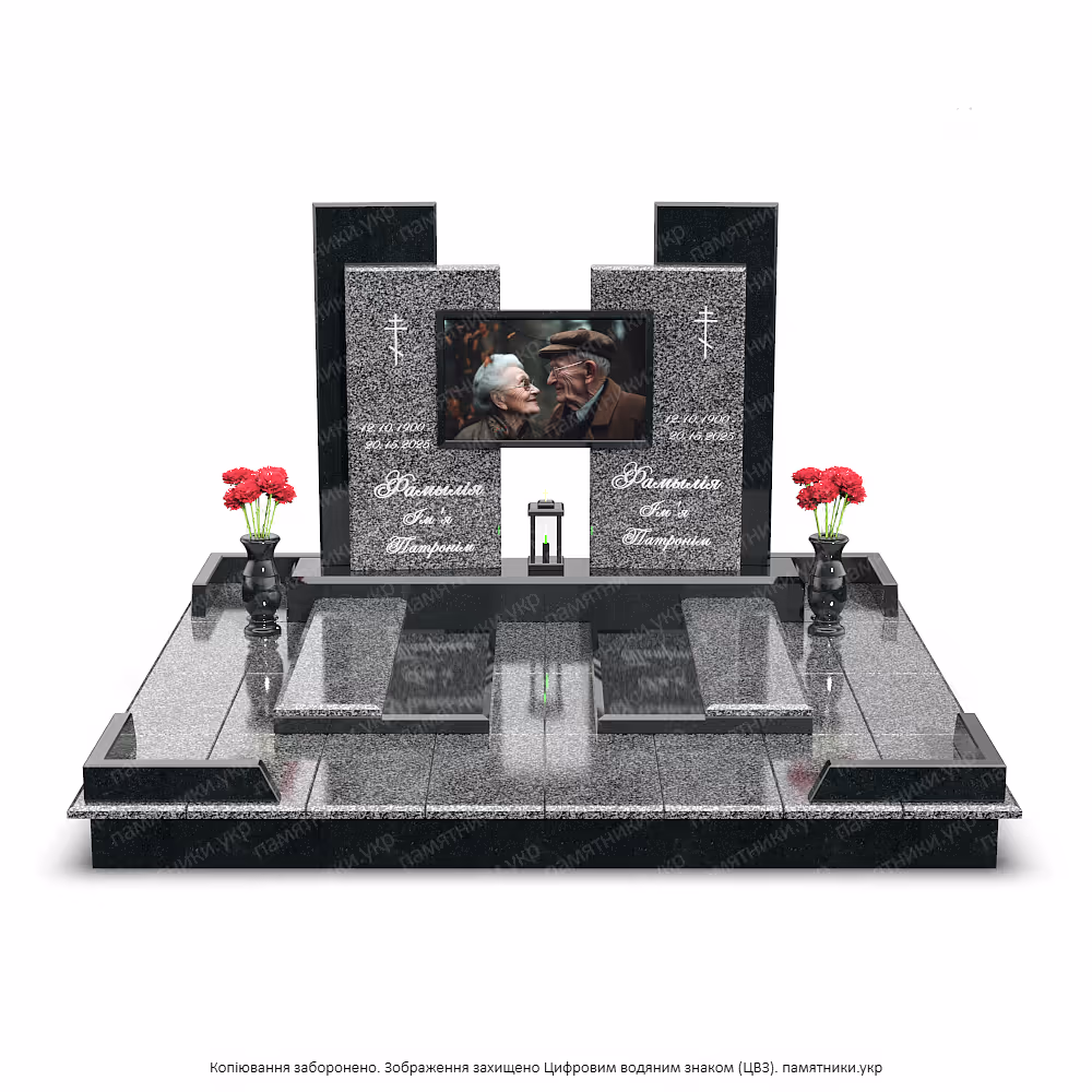Композиция: Памятник состоит из двух вертикальных стел, выполненных из серого натурального камня с красивой зернистой фактурой. Они объединены центральной вставкой из черного полированного камня, на которой размещен общий цветной портрет усопших. Такое решение символизирует неразлучность пары.