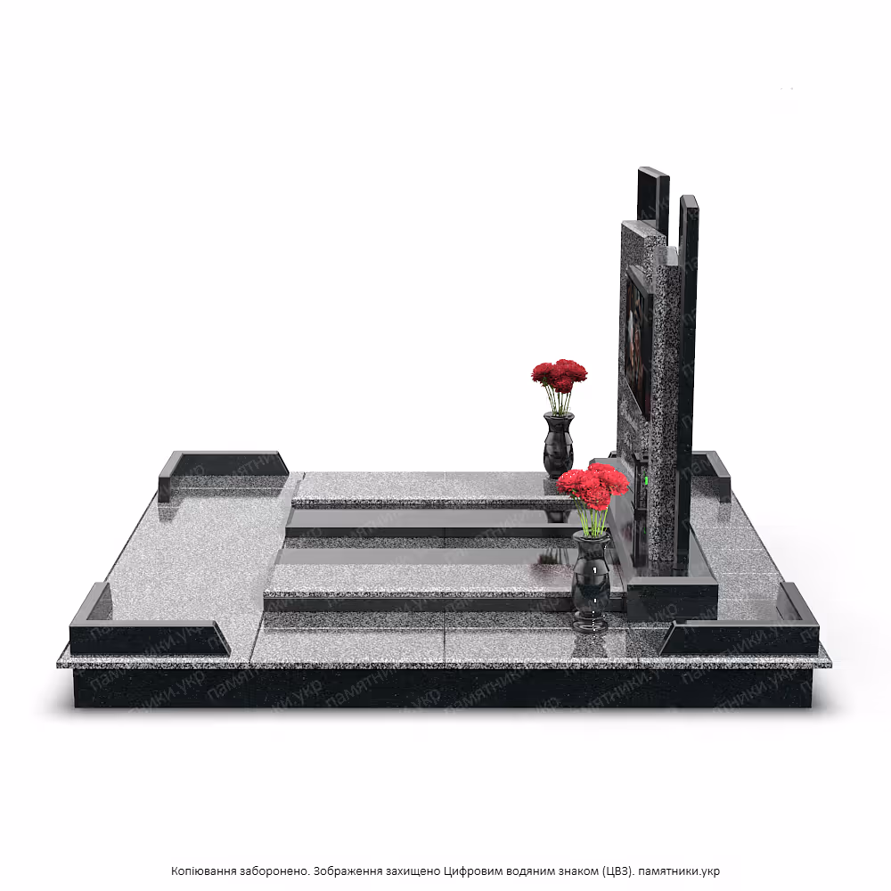 Этот масштабный мемориальный комплекс разработан специально для семейного захоронения. Симметричная композиция и благородное сочетание материалов подчеркивают единство и вечную связь близких людей.