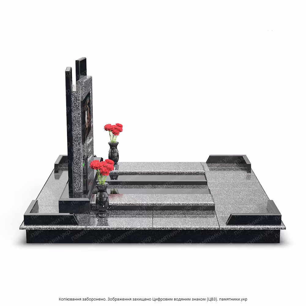 Благоустройство: Комплекс установлен на надежный фундамент, полностью облицованный плиткой из серого натурального камня. Это обеспечивает чистоту и ухоженный вид захоронения в любое время года.