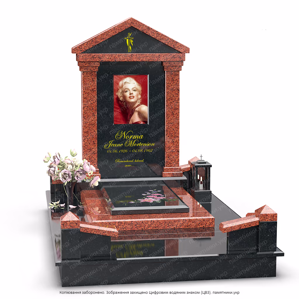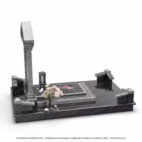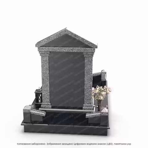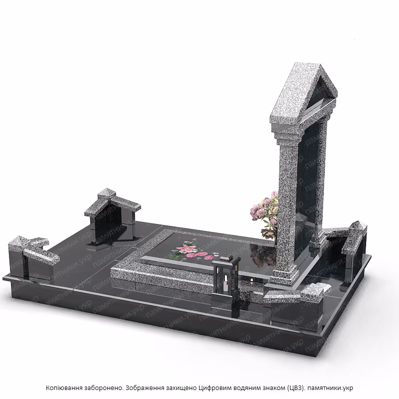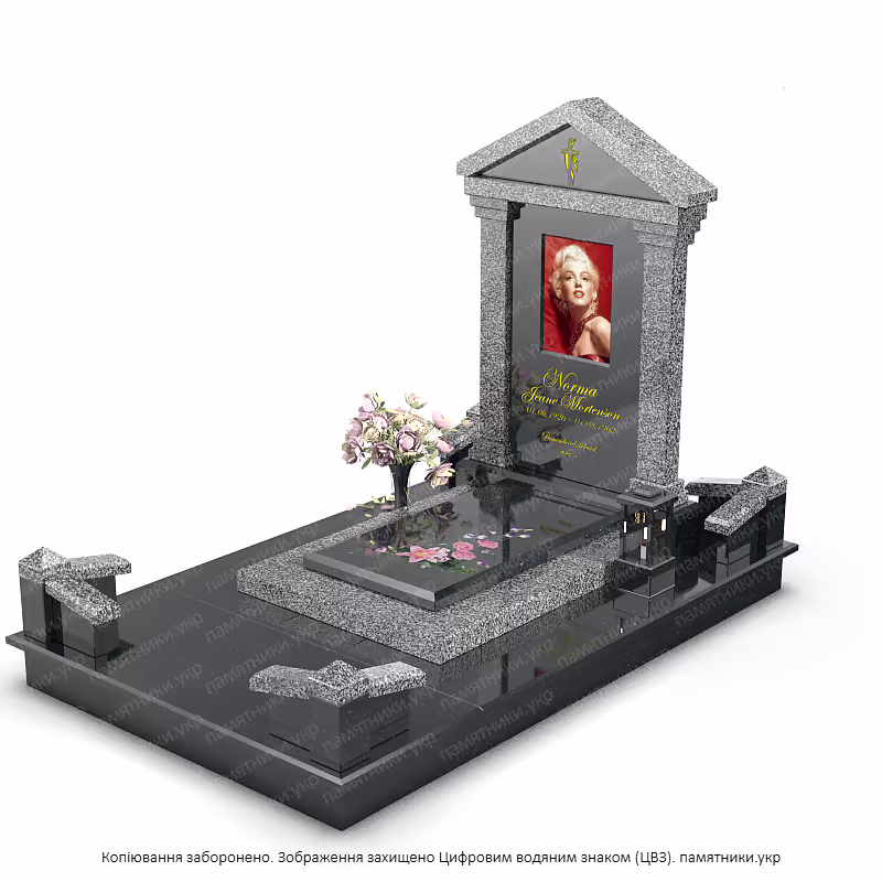 Стела: В центре композиции находится плита из черного полированного камня. Глубокий темный цвет служит идеальным фоном для цветного портрета и золотой эпитафии, обеспечивая высокую контрастность и читаемость.