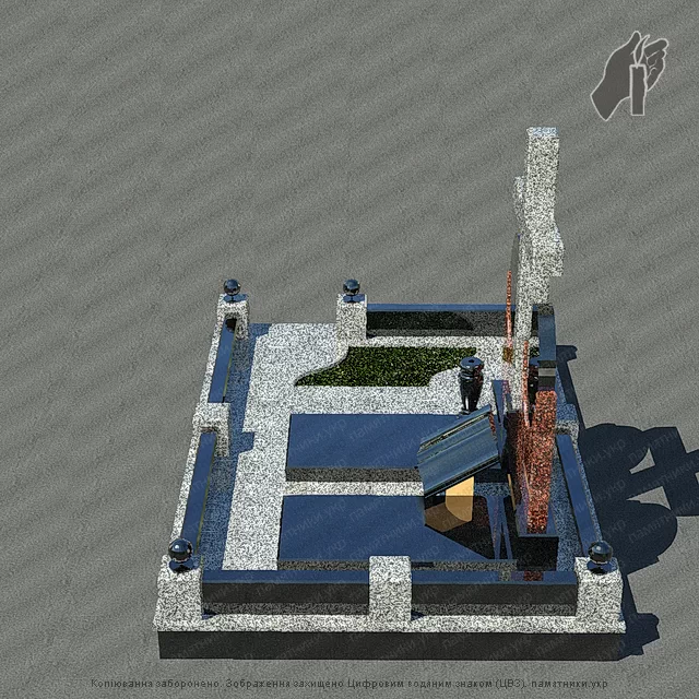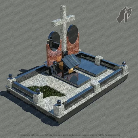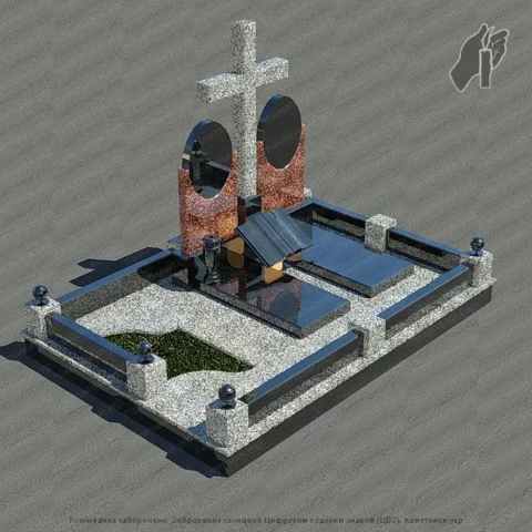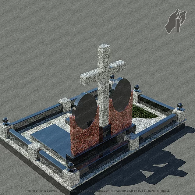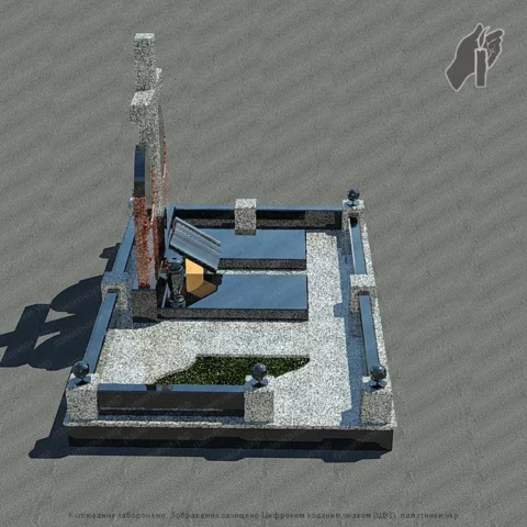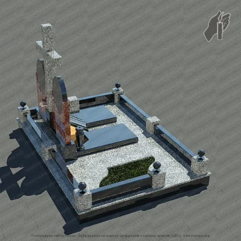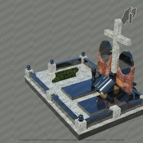 В комплексе предусмотрено место для миниатюрной декоративной клумбы рядом с захоронением. Овалы на плитах предназначены для нанесения портретов, а надпись разместить на горизонтальных плитах.