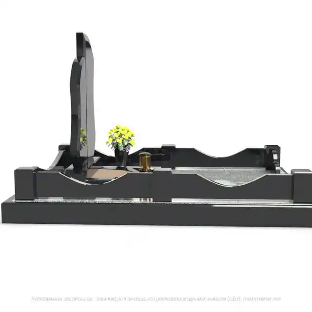 Каплевидные элементы надгробья имеют достаточно места для нанесения портретов, информации или рисунков. Лаконичное гранитное ограждение с декоративными столбиками завершает композицию.