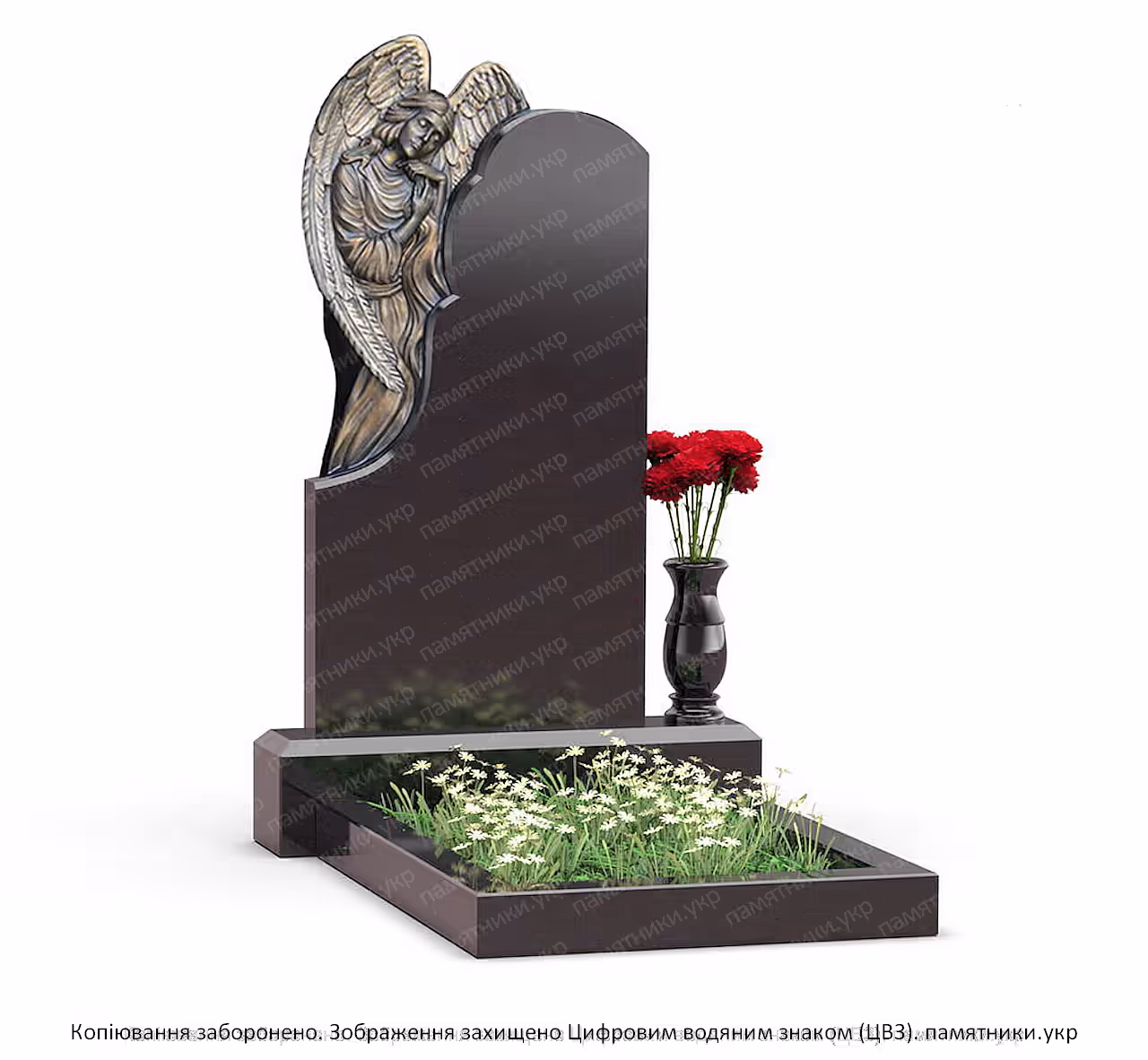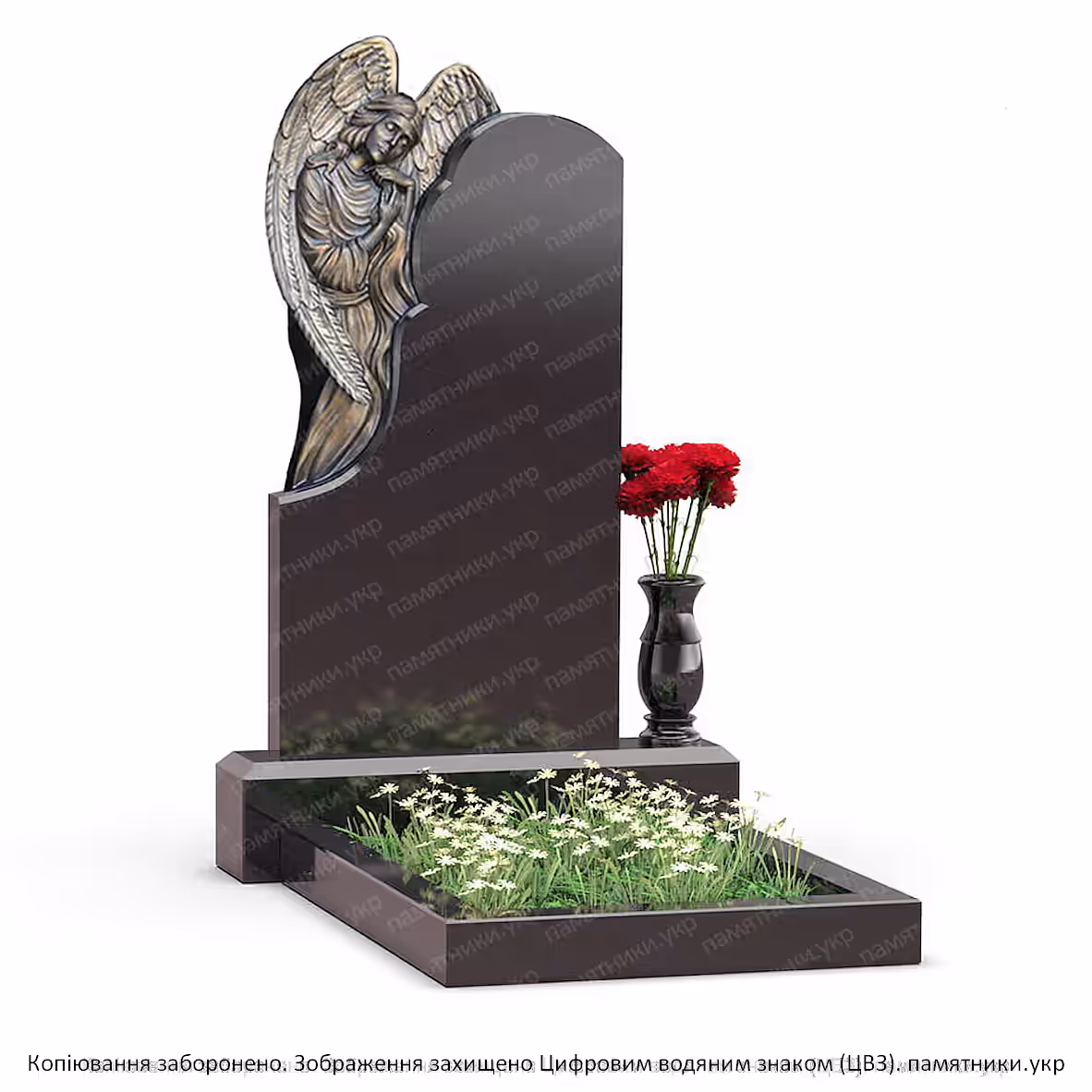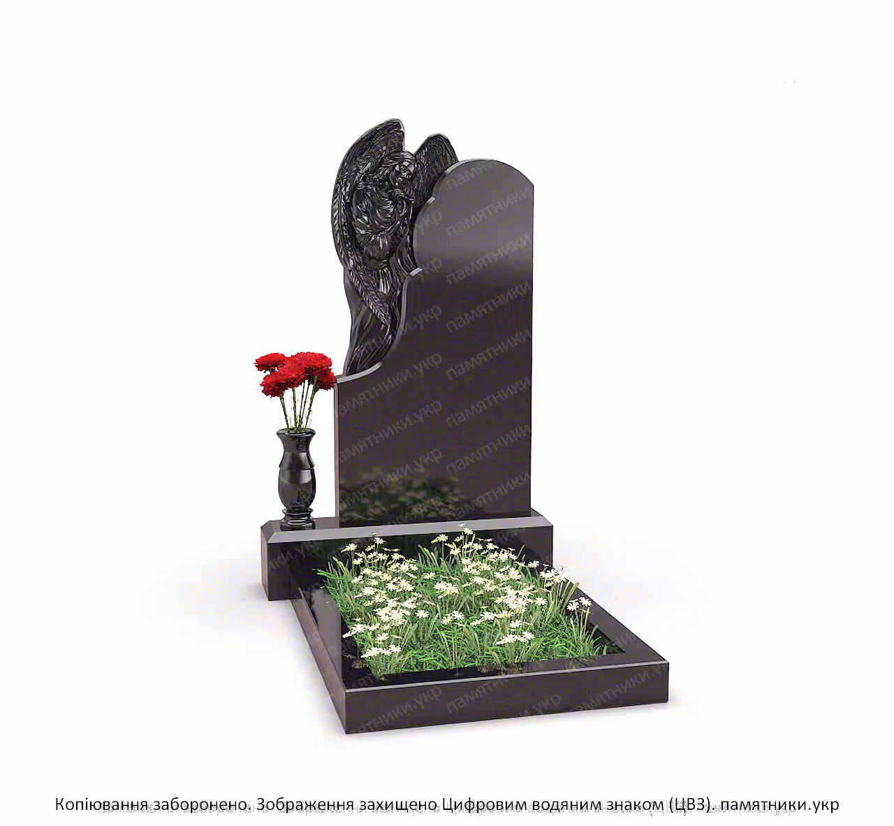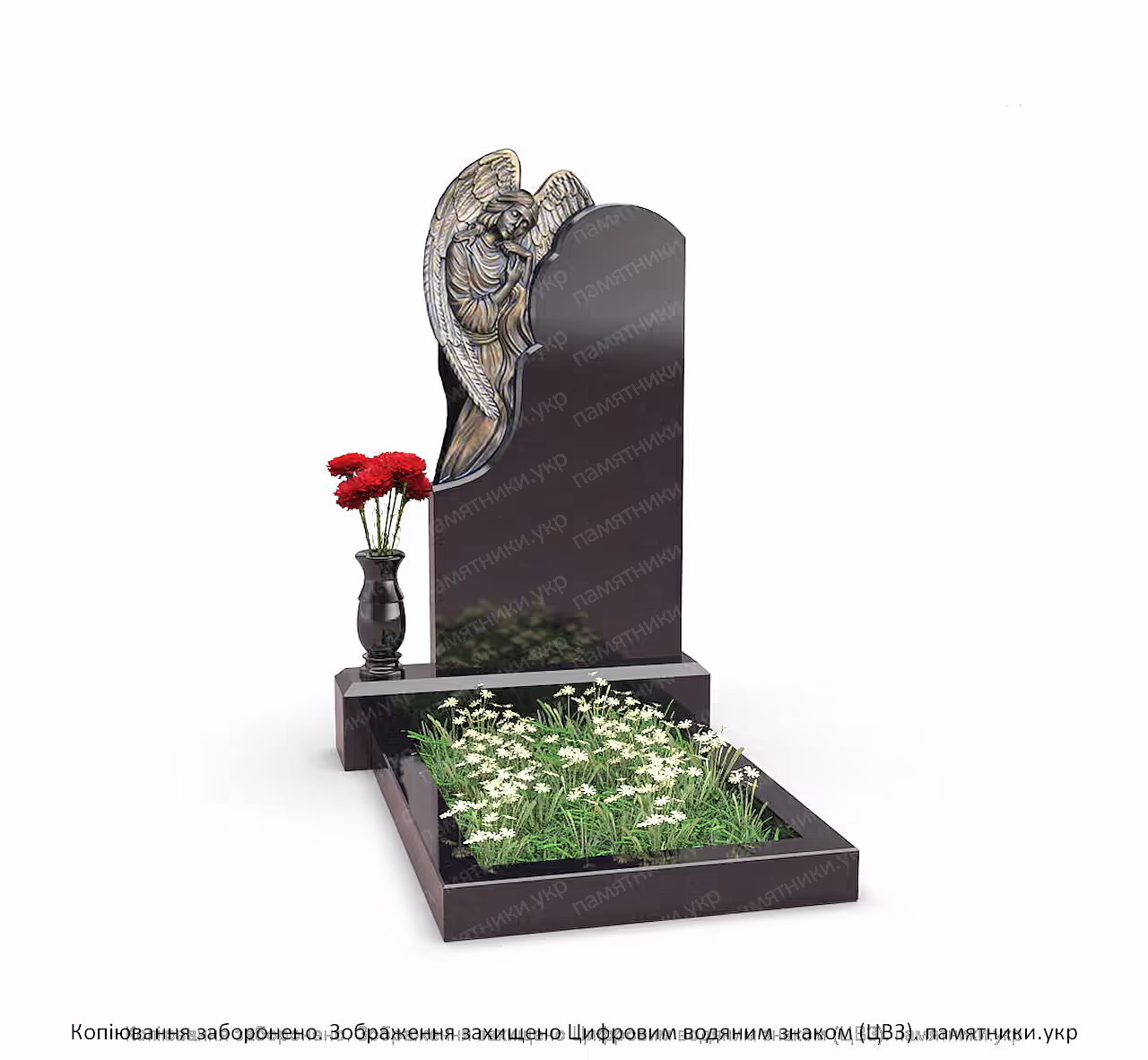 Памятник на могилу с ангелом выполнен из полированного черного гранита и дополнен декоративной скульптурой ангела. Такая композиция символизирует память, защиту и вечный покой. Вертикальная стела строгой формы гармонично сочетается со скульптурным элементом и гранитным основанием.