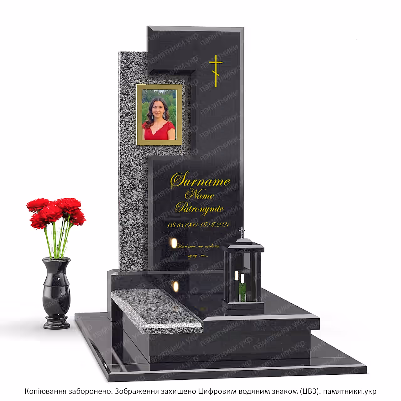 Современный памятник на могилу из черного и серого гранита с портретом и православным крестом. Конструкция выполнена в комбинированном дизайне и включает вертикальную стелу асимметричной формы, зону под портрет, золочёную надпись, массивное гранитное основание и декоративные элементы. Памятник подходит для одиночного захоронения и подчёркивает индивидуальность оформления места памяти.