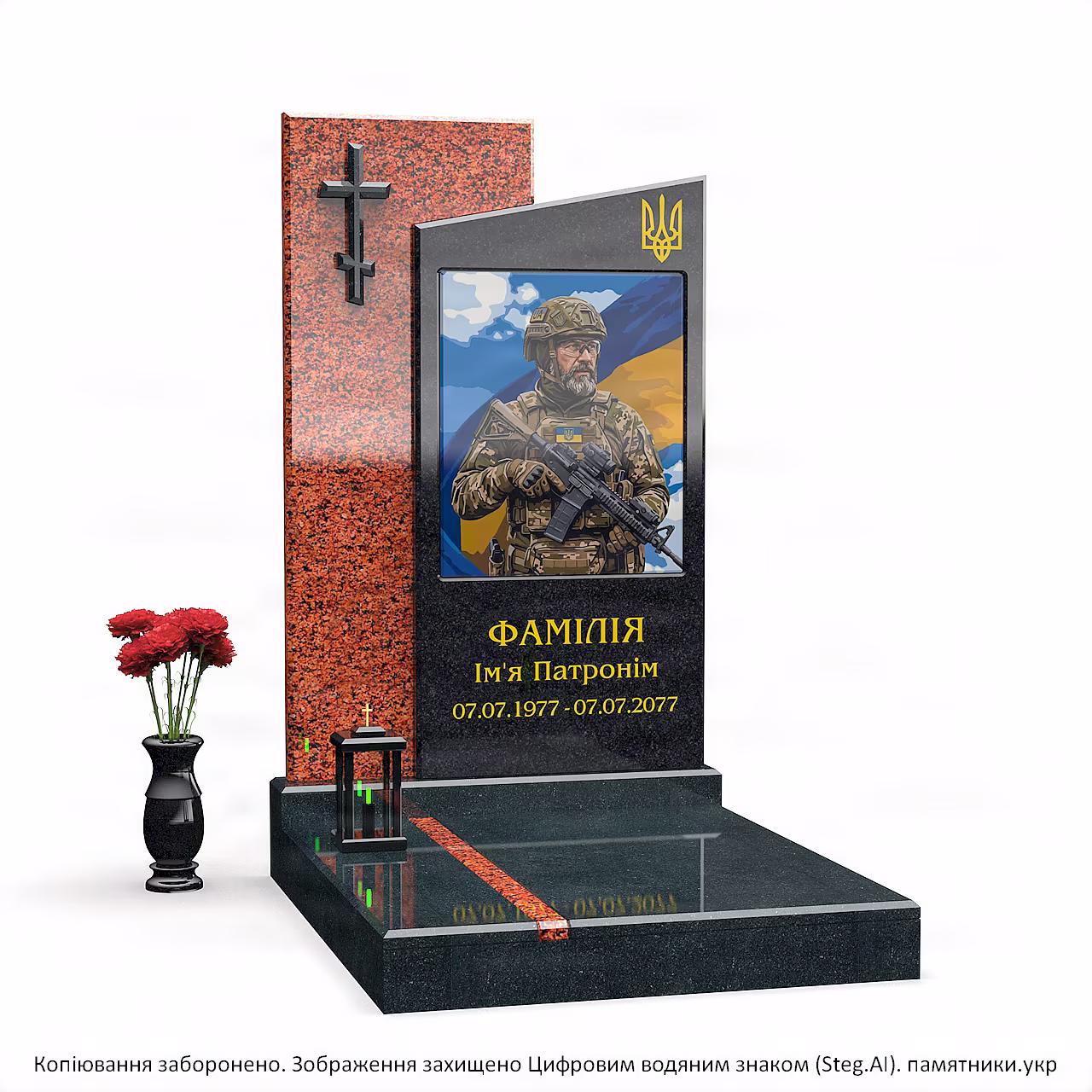 Модель S53 — это современный мемориал, созданный для того, чтобы максимально точно и ярко сохранить образ защитника. Главной особенностью является использование технологии цветной фотопечати, что выделяет этот комплекс среди классических надгробий.