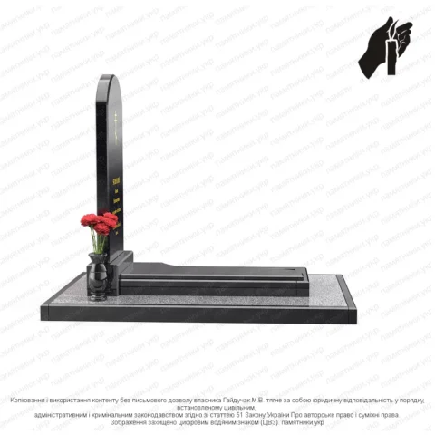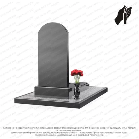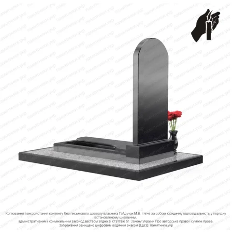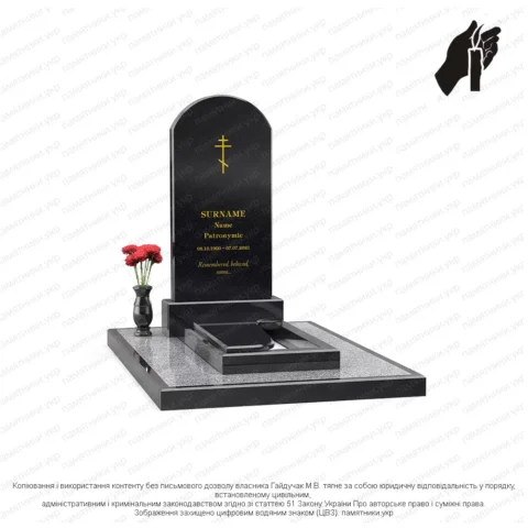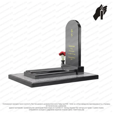 Стела: Выполнена из глубокого черного полированного камня. Верхняя грань имеет плавное закругление (арку), что смягчает строгую геометрию плиты. Идеальная зеркальная полировка камня создает выразительный контраст с золотой гравировкой православного креста и эпитафии.